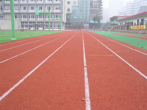 EPDM透氣型塑膠跑道, 首先需對水泥基礎(chǔ)進(jìn)行防水處理或瀝青基礎(chǔ)進(jìn)行封底處理。待基礎(chǔ)層處理完畢保養(yǎng)24小時后即可攤鋪跑道底層,用3-4mm的高彈性橡膠黑色再生膠粒加入相對比例的聚氨酯粘接膠水,攪拌均勻倒入場地,刮耙刮平,鋪設(shè)厚度8mm,固化保養(yǎng)24小時。用2-3mm的EPDM跑道面層材料加聚氨酯粘接劑攪拌均勻后倒入施工場地,刮耙刮平,用鐵板或者機(jī)械壓實,平整度達(dá)到國家標(biāo)準(zhǔn),特殊花紋設(shè)計、耐磨防滑,一體成型面層,厚度均勻,不掉顆粒,不鼓泡,耐老化,色彩鮮艷,在水泥基礎(chǔ)上鋪裝最佳