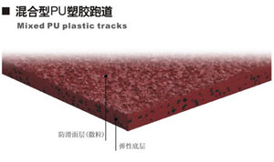 將含塑膠墊層質(zhì)量25~30%輪胎膠粒與聚氨酯(PU)塑膠攪拌混合鋪設(shè)在基礎(chǔ)上的彈性體,厚度為9mm左右,面層膠上部鋪設(shè)2~3mm厚的純(PU)膠漿,撒上EPDM防滑粒作為磨損面層,鋪設(shè)總厚度為9~13mm。具有適度的彈性,維護(hù)方便,節(jié)省管理費(fèi)用,適合于各級(jí)比賽、學(xué)校教學(xué)、訓(xùn)練等跑道場地。尤其適合水泥砼基礎(chǔ)、瀝青基礎(chǔ)鋪設(shè)粘結(jié)牢固、壽命長。