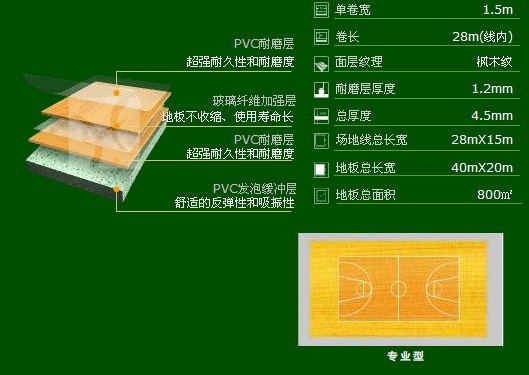 籃球場專用地板采用100%純PVC優(yōu)質(zhì)材料,面層經(jīng)特殊高環(huán)保高科技材料TPU技術(shù)處理,及具最佳耐久性和耐磨性,從而增加了地板的使用壽命。