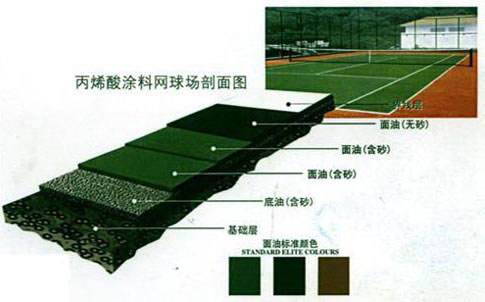 (4)維護(hù)保養(yǎng)便利,使用壽命長(zhǎng)。綜上所述,丙烯酸(硬地丙烯酸/彈性丙烯酸)涂料是目前網(wǎng)球場(chǎng)面層的首選材料。目前的主要品牌有:action-pave Tennislife Nova等。而Action-pave是中國(guó)網(wǎng)球協(xié)會(huì)授權(quán)特許使用中國(guó)網(wǎng)球協(xié)會(huì)(CTA)標(biāo)志此外,國(guó)外新興一種地面材料--懸浮式拼裝運(yùn)動(dòng)地板,因其具有使用時(shí)限長(zhǎng),減震性能好(有效吸附90%垂直沖擊力),安全性高,安裝簡(jiǎn)便,適合多種運(yùn)動(dòng)項(xiàng)目,也越來(lái)越受到星級(jí)賓館酒店,私人俱樂(lè)部,大中學(xué)校等客戶喜愛(ài)。
