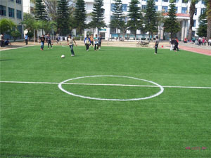 人工草坪足球場,符合球的滾動、球的彈跳、回轉(zhuǎn)力、減壓力、減少摩擦力等各項國際標(biāo)準(zhǔn)。