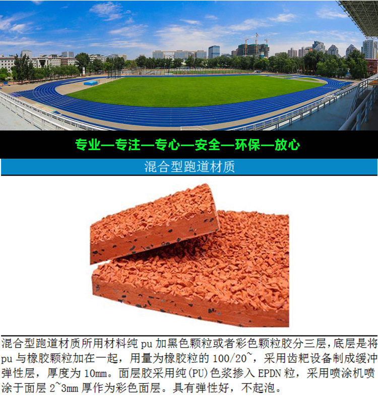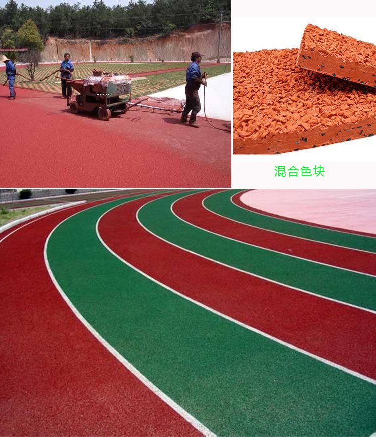 2、 不掉粒,面層的EPDM(三元乙丙)膠粒是與聚氨酯漿料、預聚體混合攪拌后,采用機械噴涂進行施工。 透氣型塑膠跑道
