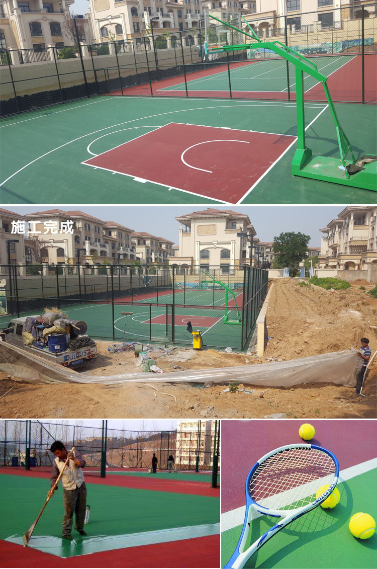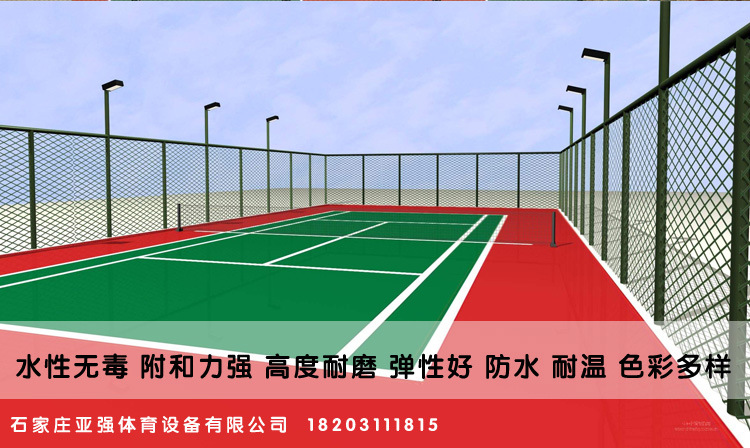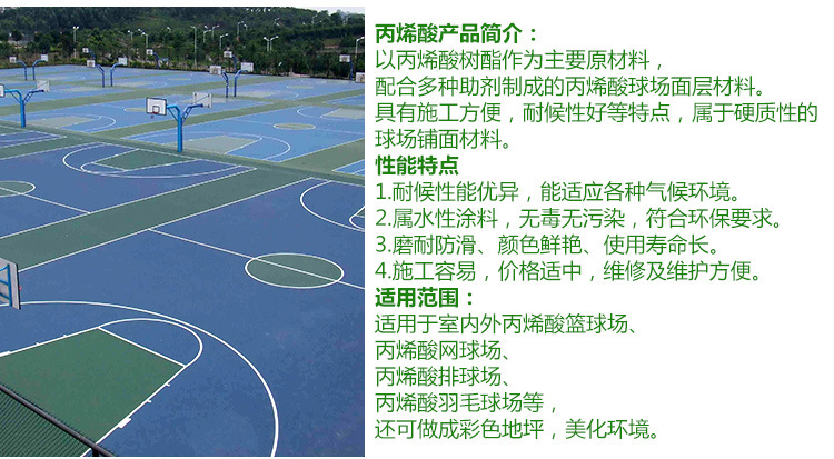 適用于室內(nèi)外丙烯酸籃球場(chǎng)、 丙烯酸網(wǎng)球場(chǎng)、 丙烯酸排球場(chǎng)、 丙烯酸羽毛球場(chǎng)等, 還可做成彩色地坪,美化環(huán)境。
